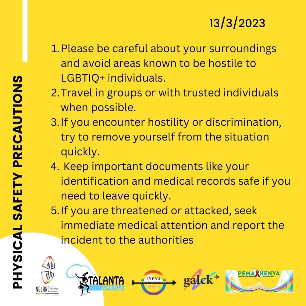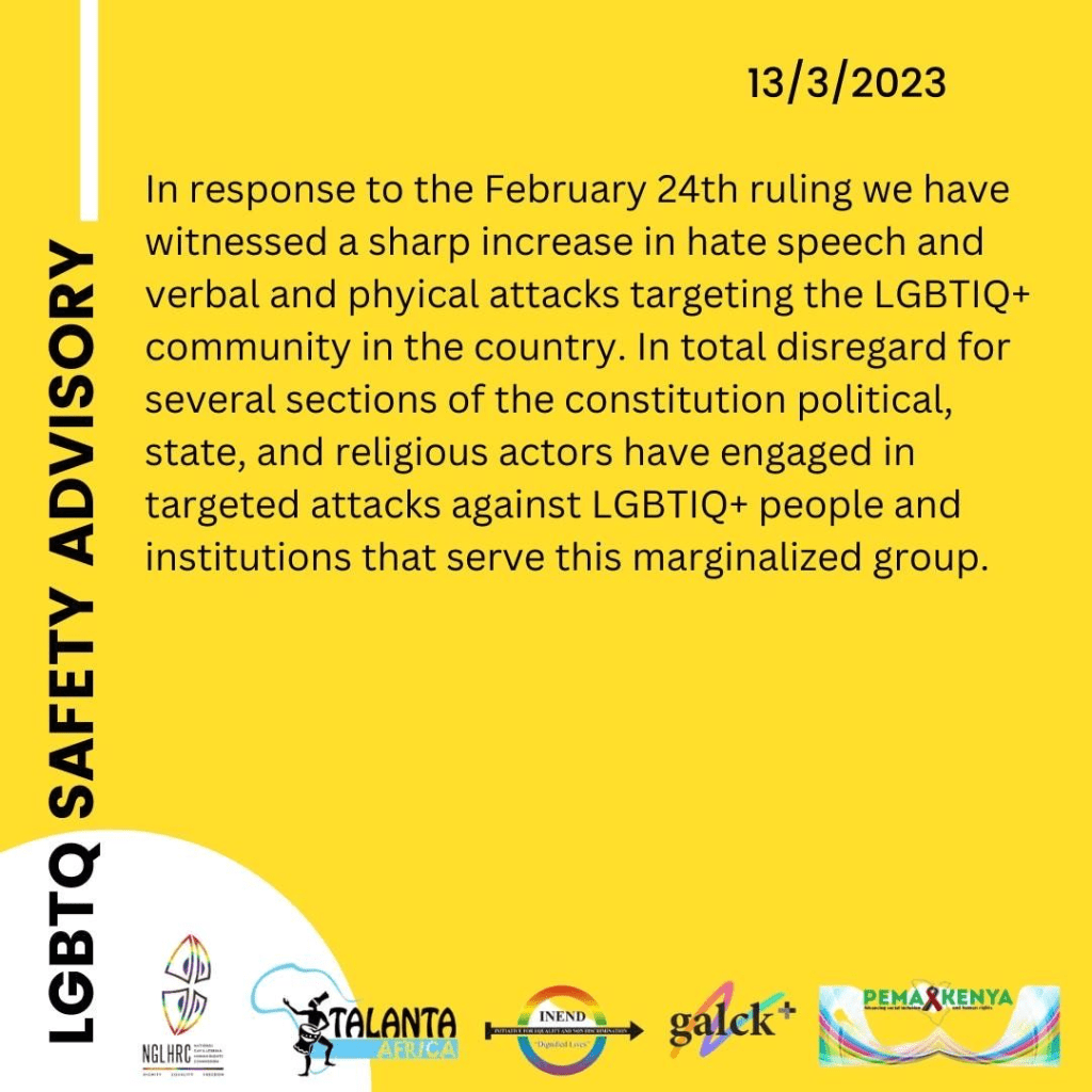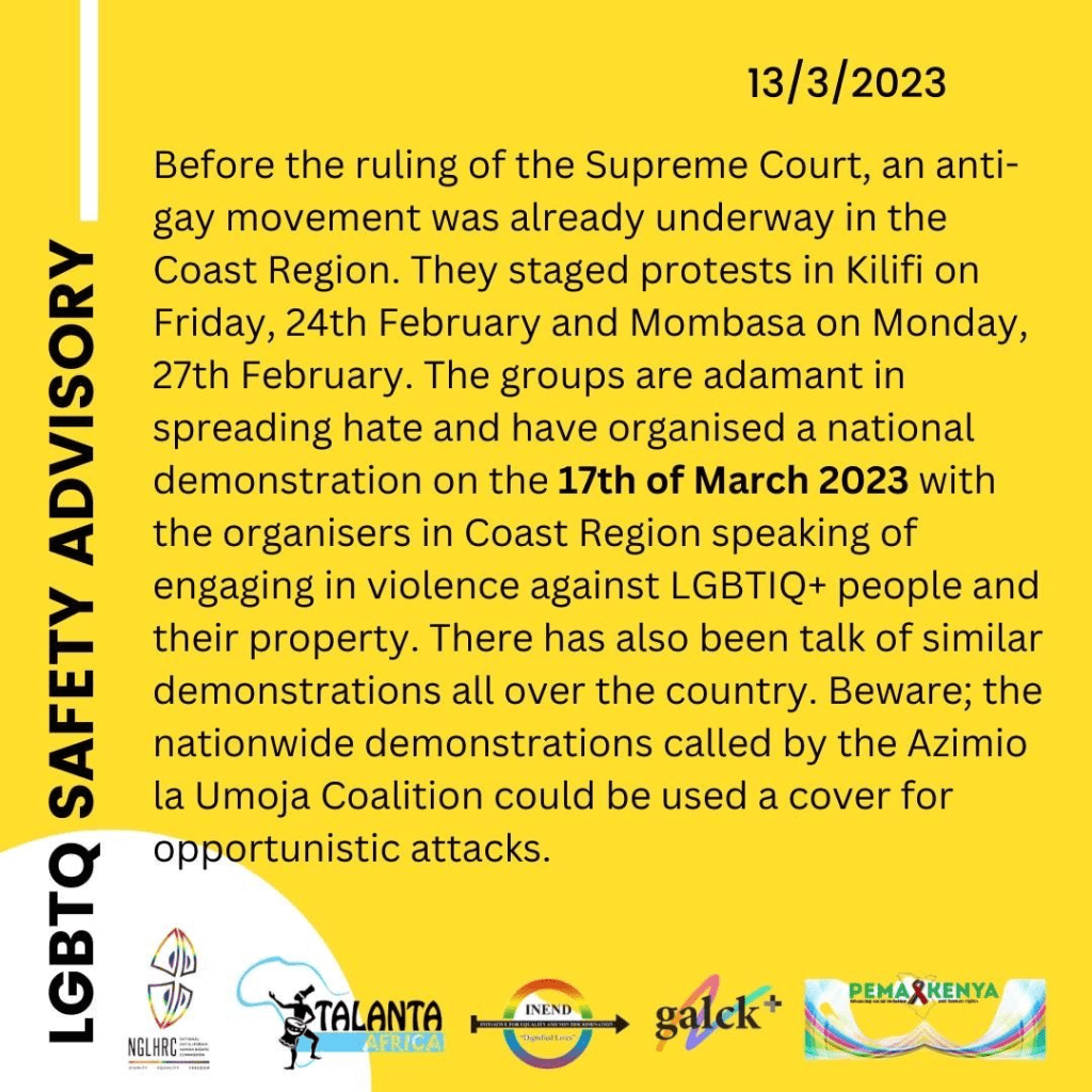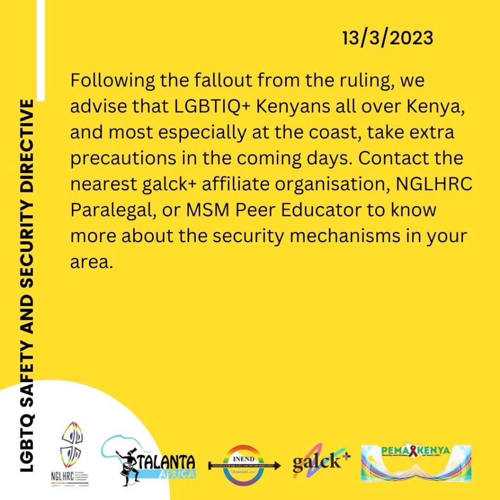 Following the fallout from the ruling, we advise that LGBTIQ+ Kenyans all over Kenya, and most especially at the coast, take extra precautions in the coming days. Contact the nearest galck+ affiliate organisation, NGLHRC Paralegal, or MSM Peer Educator to know more about the security mechanisms in your area.